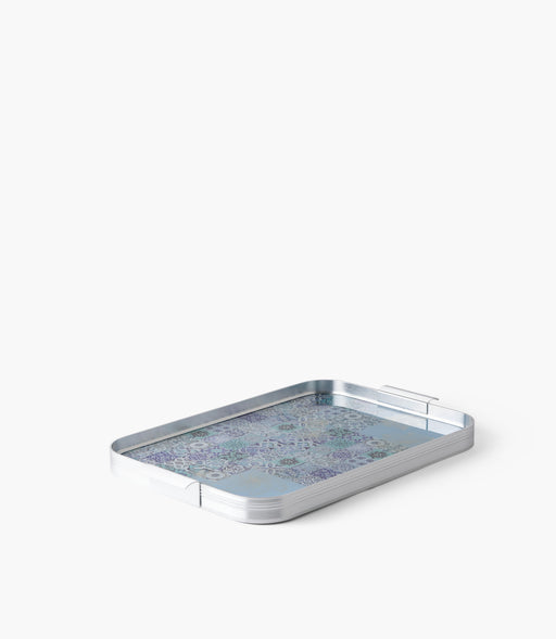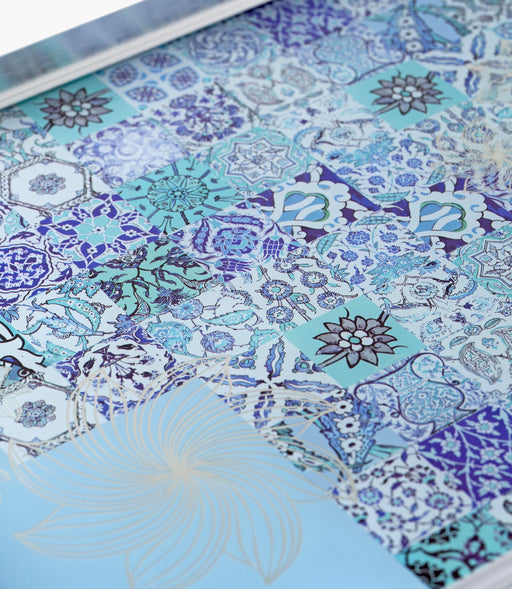صينية بلو تايلز ألمنيوم بزخارف ملونة وإطار فضي