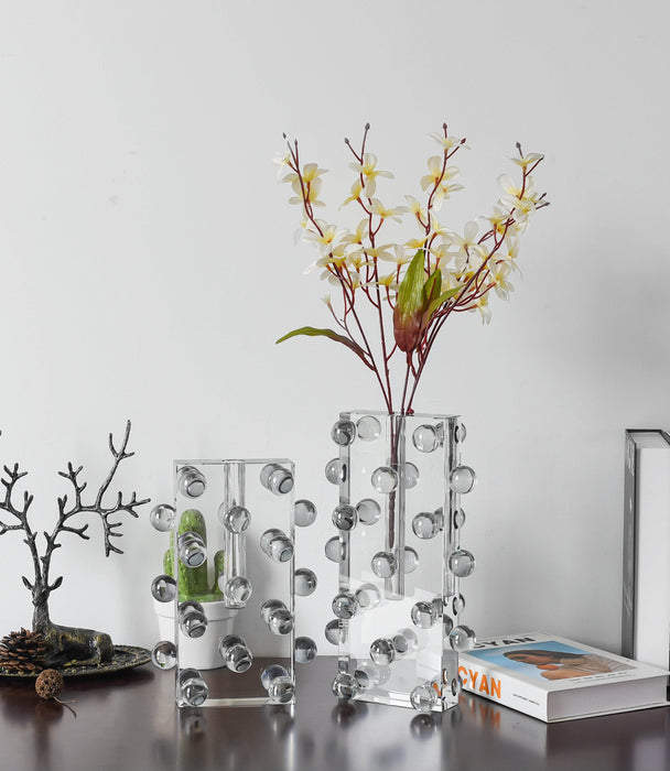 مزهرية كريستالية رمادية صغيرة بتصميم مستطيل مع تفاصيل كرات بارزة، تُضيف لمسة فنية أنيقة لأي زاوية في منزلك.