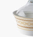 تتميز هذه السلطانية بتصميمها الجذاب، وخامتها ذات الجودة العالية من البورسلين المتين. تضفي النقوش الهندسية الدقيقة باللونين البيج والذهبي لمسة من الرقي على الطاولة، ما يجعلها مثالية لتقديم التمر والمكسرات في المناسبات الخاصة أو خلال الجلسات اليومية. الغطاء الزجاجي يضمن الحفاظ على الطعم الطازج للمحتويات بفضل تصميمه المتقن.