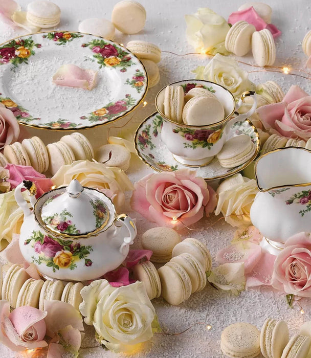عرش يتربع عليه الحلاوة ويسود. تخيلي شلال من ورد الإنجليزي بأبهى حُمرةٍ يانعة، مُخلّدٌ للأبد في خزف رقيق. تتراقص براعمٌ داكنة وأخرى وردية وصفراء على سطحه، حوافها الذهبية مُقبّلة بسحرِ ٢٢ قيراطًا. كل بتلة وكل ورقة تروي قصة الإغراء الخالد للريف الإنجليزي. ارفعي التاج المذهّب واكتشفي ملاذًا فسيحًا لأحلامك السكرية. دعوة للاسترخاء، والتذوق، وخلق ذكرياتٍ بطعمٍ لا يقل حلاوة عن السكر الذي يحتويه.