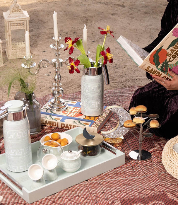 احتفل بالأصالة بلمسة عصرية مع طقم القهوة العربية زوايا. مصنوع من مواد عالية الجودة، ويتميز هذا الطقم الأنيق بفناجين قهوة عربية مصممة بعناية مع صينية متناسقة، مزينتين بنقشة متداخلة بلون أبيض لؤلؤي تضيف لمسة من السحر الكلاسيكي والرقي. مستوحى من الزخارف الهندسية التقليدية، تجمع مجموعة زوايا بين التراث الثقافي والأناقة العصرية، لتكون مثالية لتقديم القهوة للضيوف أو الاستمتاع بلحظات هادئة بأسلوب راقٍ.