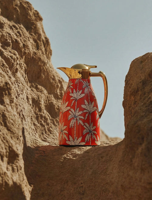 This 0.75-liter stainless steel thermos carries crisp orange with white graphic palm tree detailing. The double-walled construction keeps drinks ho...