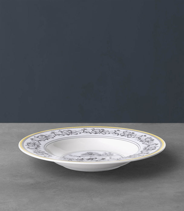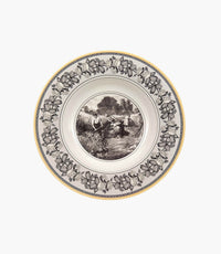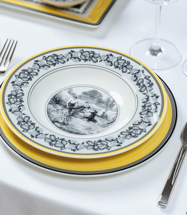 This deep plate forms part of Villeroy & Boch's country style pattern Audun Ferme. With this pattern, Villeroy & Boch exquisitely bridges past, present and future inspired by copper engraved designs from the turn of the last century. Pastoral scenes in black and white have been freshened up by a creamy yellow accent border and other graphic ornamentations. 4 patterns together yield a strong fashion statement to dress up your table or hang decorative plates on the wall. The 4 ranges are: Femme, Promenade, Fleur and Chase. Audun is a small village in what is now the Lorraine Provence of France and was the first pottery set up by the Boch members of the family