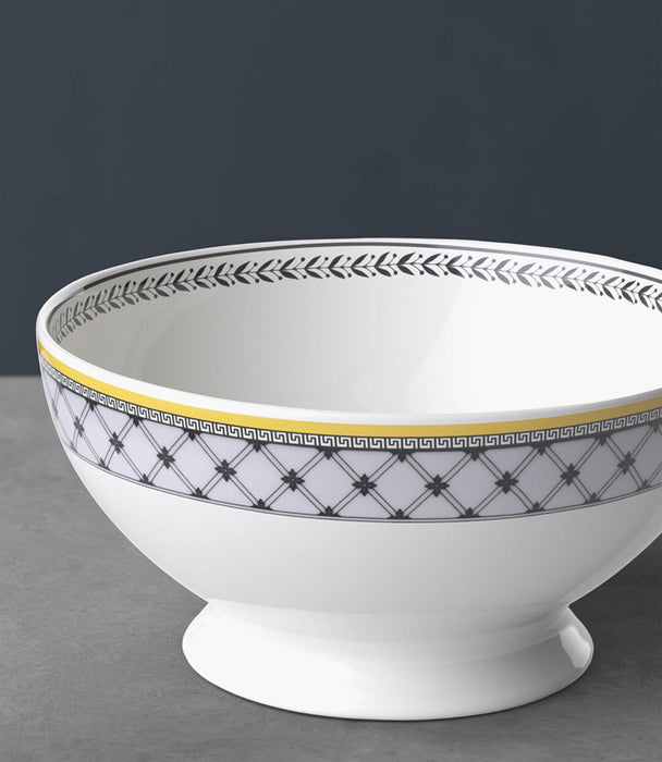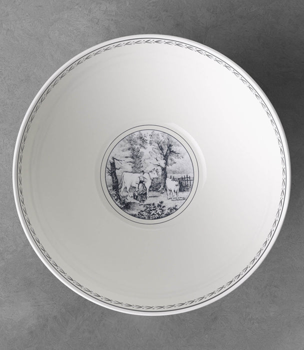 This salad bowl forms part of Villeroy & Boch's country style pattern Audun Ferme- With this pattern, Villeroy & Boch exquisitely bridges past, present and future inspired by copper engraved designs from the turn of the last century- Pastoral scenes in black and white have been freshened up by a creamy yellow accent border and other graphic ornamentations. 4 patterns together yield a strong fashion statement to dress up your table or hang decorative plates on the wall. The 4 ranges are: Femmer Promenade, Fleur and Chase- Audun is a small village in what is now the Lorraine Provence of France and was the first pottery set up by the Boch members of the family.