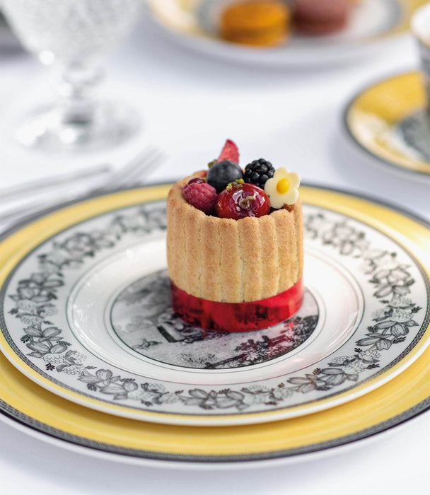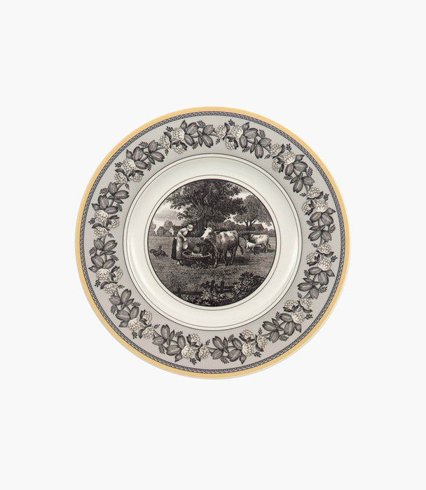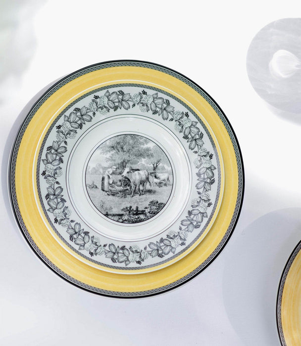 This salad plate forms part of Villeroy & Boch's country style pattern Audun Ferme. With this pattern, Villeroy & Boch exquisitely bridges past, present and future inspired by copper engraved designs from the turn of the last century. Pastoral scenes in black and white have been freshened up by a creamy yellow accent border and other graphic ornamentations. 4 patterns together yield a strong fashion statement to dress up your table or hang decorative plates on the wall. The 4 ranges are: Femme, Promenade, Fleur and Chase. Audun is a small village in what is now the Lorraine Provence of France and was the first pottery set up by the Boch members of the family