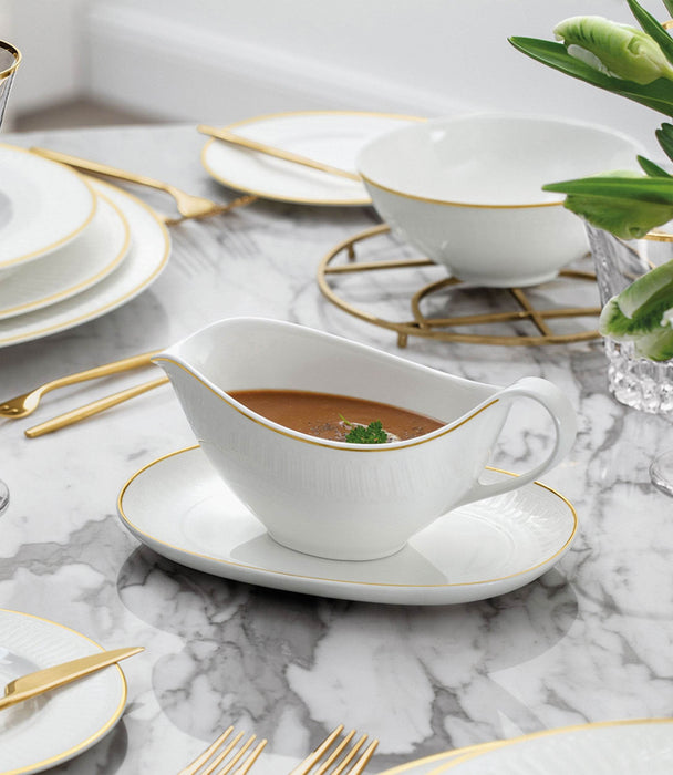 Chåteau Septfontaines impresses with its unique textured relief, a combination of glossy and matt finishes and fine 20 carat gold details. We also have the matching saucer for this gravy boat — to make it a practical style highlight for every occasion. Explore the combination of a beautiful textured relief and finest gold fillet.