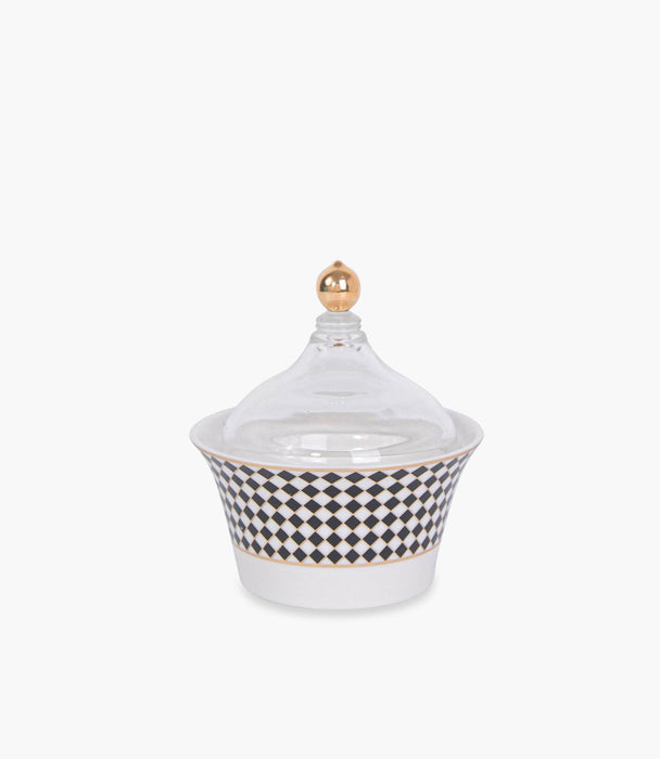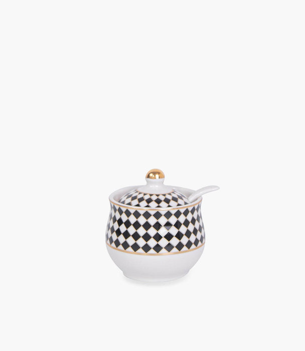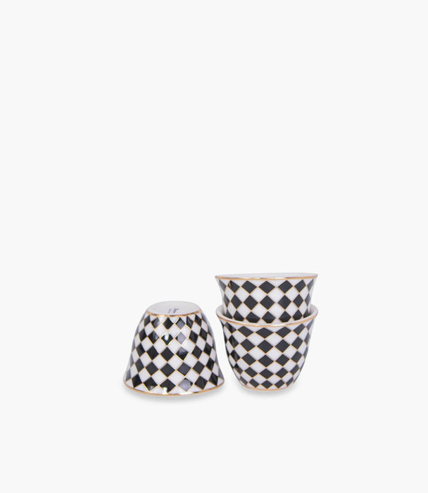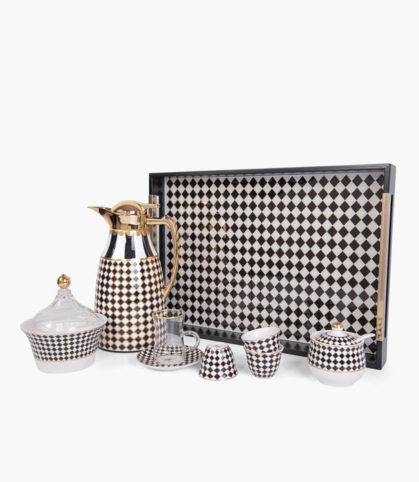 Elevate your coffee and tea experience with the Circus Black & White/Gold Collection, a premium material set designed for those who appreciate timeless style. Featuring beautifully crafted cups, bowls, and a matching tray, each piece showcases a classic black-and-white checkered pattern with luxurious gold accents. Perfect for both everyday indulgence and elegant gatherings, this set combines sophistication with a bold, artistic flair.
