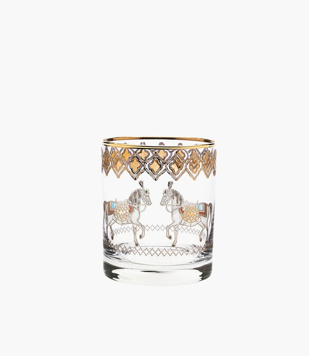 Captivate your guests with this set of six amber short drink glasses from the Horse collection by Villeroy & Boch. The set showcases a captivating amber and gold horse motif, adding a touch of elegance to every sip.