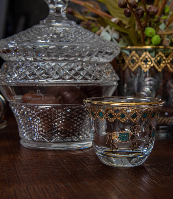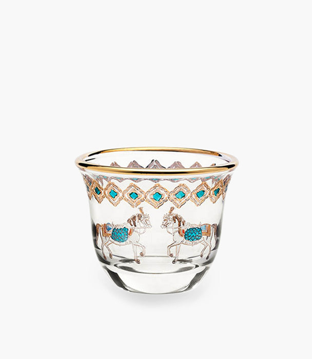 This 6-piece set is crafted from clear glass and finished with a 24k gold rim, adding just the right amount of shine. Each cup features an intricate design of royal horses in soft Tiffany accents, framed by a geometric pattern that wraps gracefully around the top.