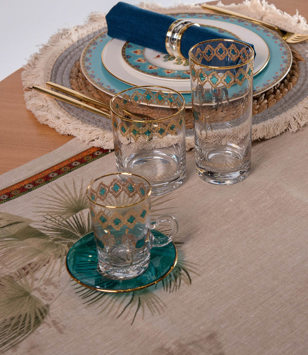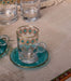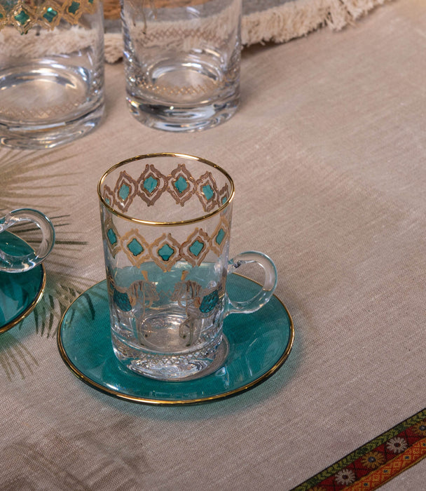 The set includes six beautifully crafted glass tea cups and matching saucers, which feature a solid Tiffany color and are adorned with a 24-karat gold rim. Another gold rim elegantly decorates each cup, which also showcases unique decorative motifs, including a white horse with Tiffany and gold accents. The clear glass adds a refined touch and complements the vibrant tones of your favorite tea blends—perfect for both daily use and elegant gatherings.