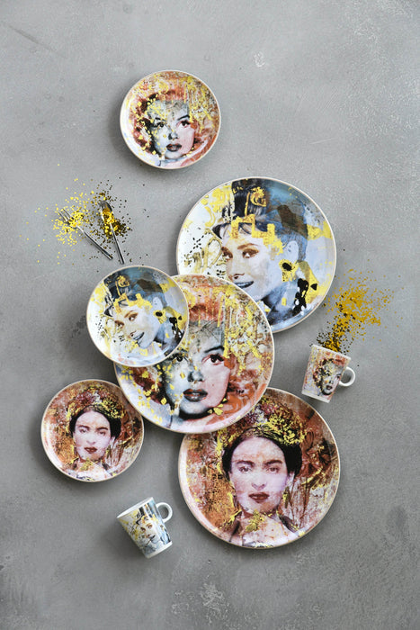 Indulge in Hollywood glam with Baci Milano's Memories Marilyn Monroe Cake Plate. Measuring 32.5 cm and made from porcelain with a golden finish, this cake plate pays homage to the legendary style icon. Baci Milano's new "Memories" collection showcases refined textures and skillful plays of color, bringing a touch of retro flavor to its range of cushions, poufs, rugs, accessories for the table, and home. Packaged in an elegant gift box, it's a great gift idea for the new homeowner or a chic addition to your own collection. Let the Memories collection's unparalleled charm and elegance add a touch of sophistication to your home. Perfect for trendsetters who love Hollywood glam, elevate your cake presentation with the Memories Marilyn Monroe Cake Plate.
