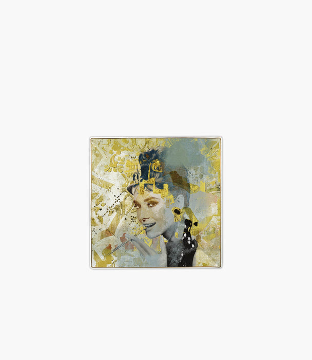The Memories Porcelain Maxi Tray with the face of Audrey Hepburn is a beautiful tribute to one of the most iconic actresses of all time. Made of high-quality porcelain, this tray features a stunning image of Audrey Hepburn that captures her timeless elegance and beauty. Measuring 27x27cm, this tray is larger than the midi size and provides ample space for serving snacks, appetizers, or desserts. It also makes a beautiful decorative item that can be used to display candles, books, or other small items on a coffee table or dresser. Like the Marylin Monroe tray, this Audrey Hepburn tray is adorned with a golden finish that adds a touch of glamour and sophistication to the design.The golden accents perfectly complement the vintage-inspired image of Audrey Hepburn and create an air of timeless elegance. Part of the Memories collection by Baci Milano, this tray is a testament to the brand's commitment to creating home decor and tableware items that exude charm and refinement. The collection features refined textures, skilful plays of colour, and a retro flavour that is sure to add an unparalleled charm and elegance to any home.Packaged in an elegant gift box, the Memories Porcelain Maxi Tray 27x27cm - Audrey Hepburn is a wonderful gift idea for anyone who loves vintage-inspired decor or admires the timeless beauty of Audrey Hepburn. It's also a great addition to your own collection if you're looking to add a touch of sophistication and elegance to your home.