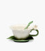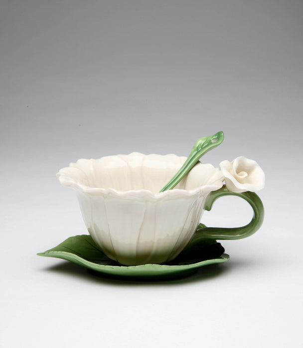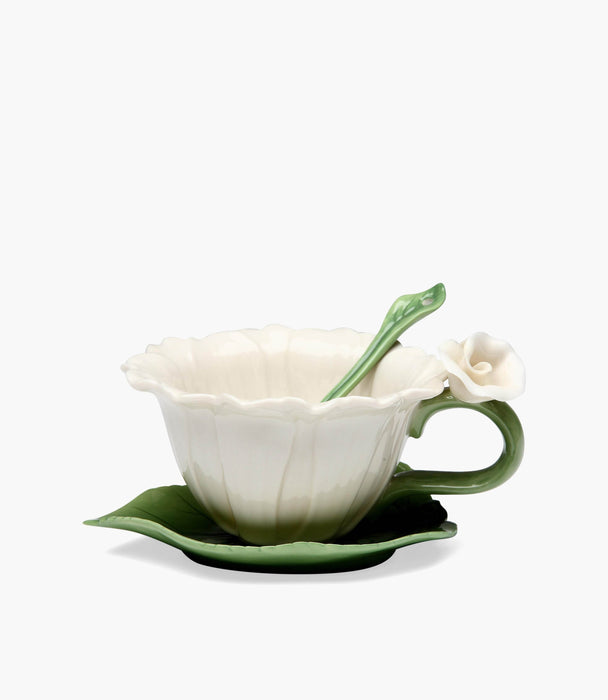 It is made from high-quality porcelain with a smooth, glossy finish, pairing beauty with durability, seamlessly elevating tea breaks, morning coffees, or dessert hour. The crisp white petals and soft green accents create a fresh, refined vibe perfect for every occasion.