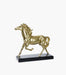 Sleek and commanding, this horse sculpture is cast in resin with a luxurious gold finish that draws the eye. It rests on a bold black base and brings contrast and presence to your home setting. It’s part of the Textured Treasures Collection and makes a statement of power and elegance on shelves, consoles, or desks.